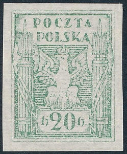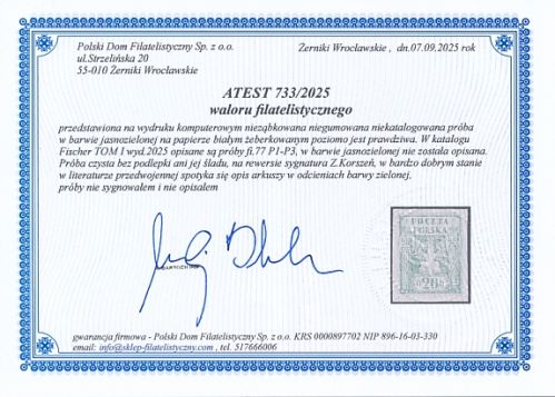 próba nieząbkowana niegumowana niekatalogowana w barwie jasnozielonej na papierze średnim żeberkowanym poziomo - y, w katalogu Fischer TOM I wyd.2025 nie została opisana inne próby w katalogu oznaczone fi.77 P1-P3. W literaturze okresu międzywojennego opisane są próby w odcieniach barwy zielonej które znajdowały się w Muzeum Poczty w Warszawie , w okresie wojny niemieckie władze okupacyjnego przekazały arkusze kupcom które po pocięciu przedostały się na rynek filatelistyczny. Gwarancja firmowa Andrzej Bartoch PDF