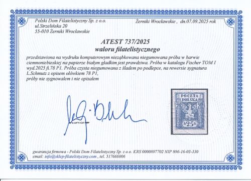 próba czysta niezÄ…bkowana niegumowana w barwie ciemnoniebieskiej na papierze biaÅ‚ym gÅ‚adkim z Å›ladem po podlepce w katalogu Fischer TOM I wyd.2025 - fi.78 P1 , gwarancja firmowa
