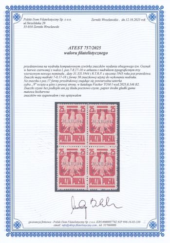 znaczki czyste bez podlepki ani jej śladu z walca I z nadrukiem typograficznym z poz.7-8,17-18 z formy 50 znaczkowej z usterką powtarzalną z poz.17 - cyfra 9 wcięta u góry z prawej strony w katalogu Fischer TOM I wyd.2025 fi.346 B2 , gwarancja firmowa