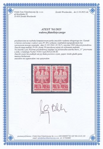 znaczki czyste bez podlepki ani jej śladu z walca I z nadrukiem typograficznym z poz.29-30 z formy 50 znaczkowej z usterką powtarzalną z poz.30 - litera P przerwana u dołu w katalogu Fischer TOM I wyd.2025 fi.346 B5 , gwarancja firmowa