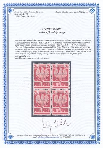 znaczki czyste bez podlepki ani jej śladu z walca I z nadrukiem typograficznym z poz.34-35,+44-45 z formy 50 znaczkowej z usterką powtarzalną z poz.45 - ukośna kreska drugiej cyfry "4" przerwana u góry w katalogu Fischer TOM I wyd.2025 fi.346 B7 , gwarancja firmowa