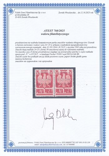 znaczki czyste bez podlepki ani jej śladu z walca I z nadrukiem typograficznym z poz.24+25 z formy 50 znaczkowej z usterką powtarzalną z poz.25 - spacja pod P w katalogu Fischer TOM I wyd.2025 fi.346 B9 , błąd występuje w części nakładu , gwarancja firmowa
