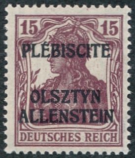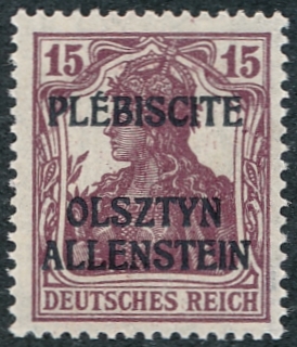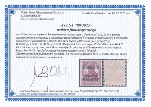 znaczek czysty bez podlepki ani jej śladu w barwie ciemnokarminowobrązowej ( Mi.142 b ) znaczek tzw. zwycięstwa z przesuniętym nadrukiem do góry, napis Allenstein nie zakrywa już napisu Deutsche Reich w nakładzie szacunkowym 200 sztuk. Nadruk typograficzny Drukarni Państwowej w Berlinie , z dodatkowego nakładu z sierpnia 1920 roku. Znaczek zachowany w idealnym stanie zachowania gwarancja firmowa Andrzej Bartoch PDF - Polski Dom Filatelistyczny. To najrzadszy znaczek Poczty Plebiscytowej - Olsztyn.